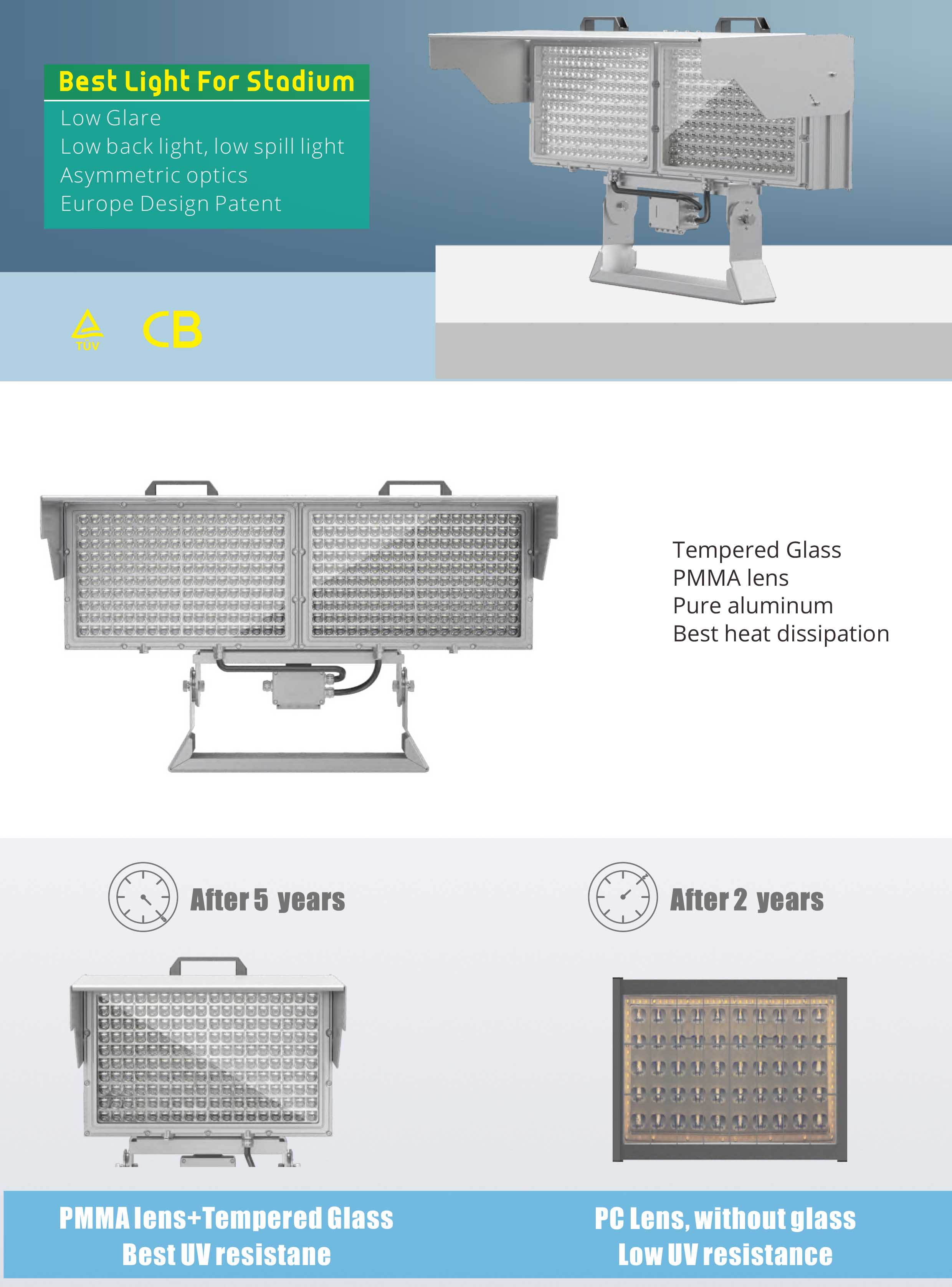 1. With PMMA lens+ tempered glass, best UV resistance, pure alumium housing, best heat dissipation